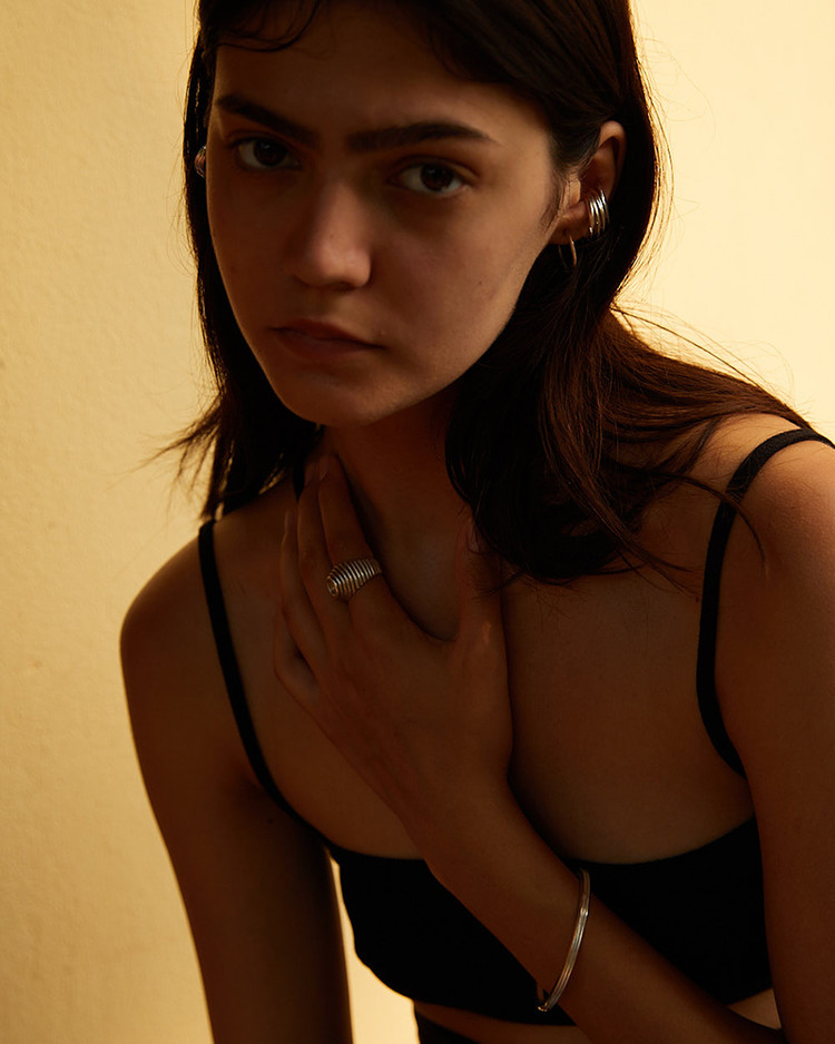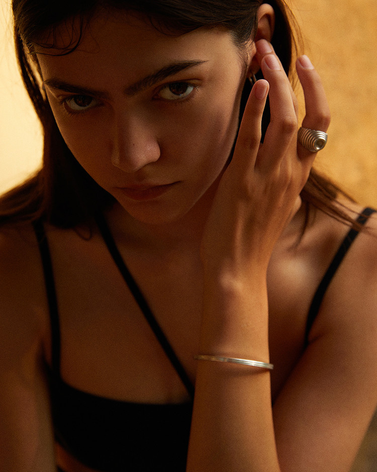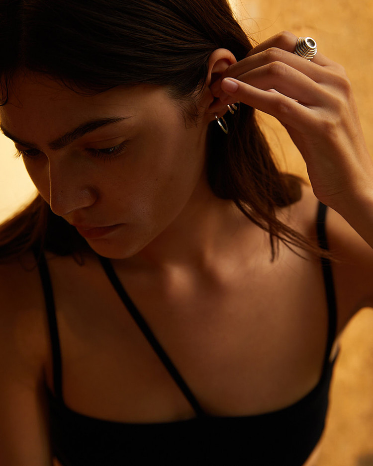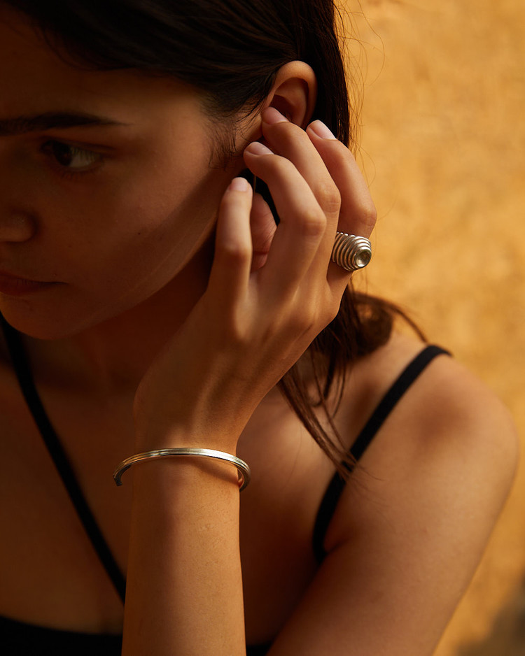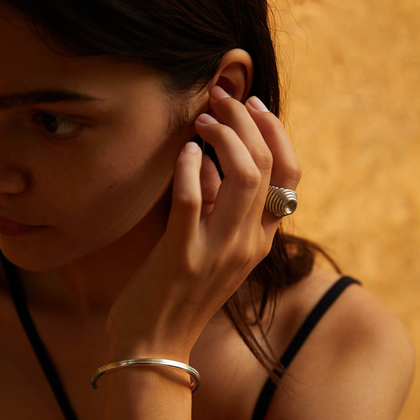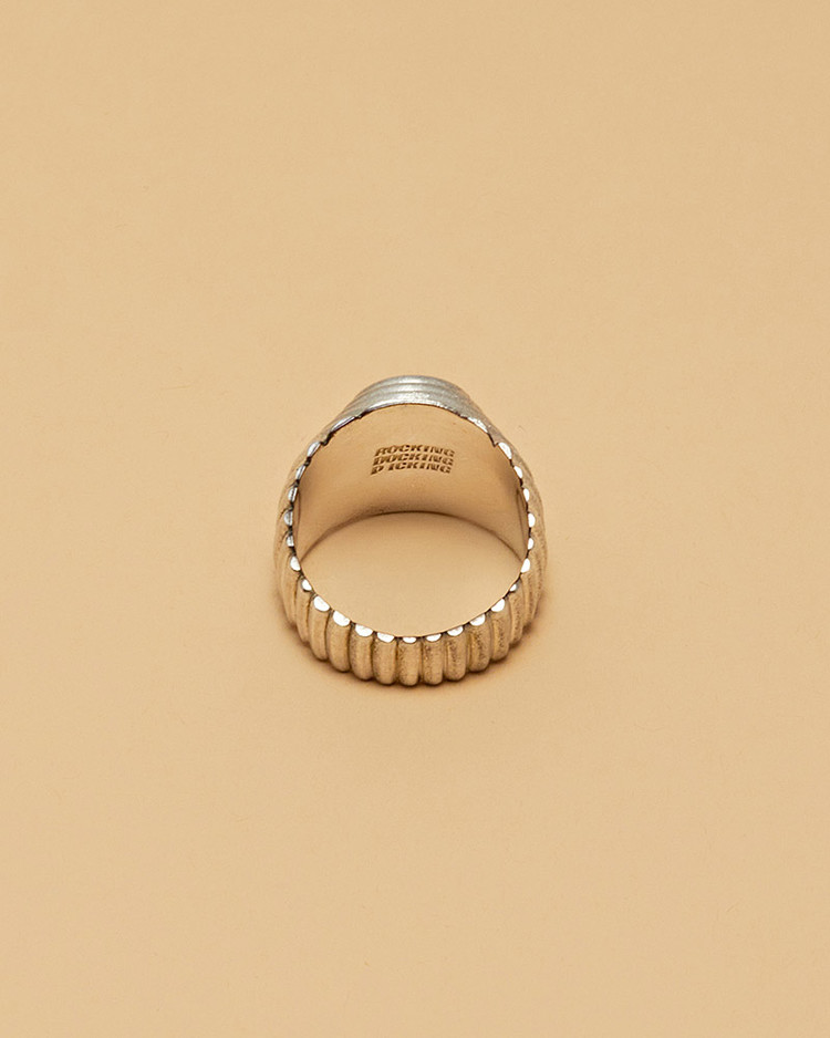 ROCKING DOCKING PICKING의 시그니처 링으로 반복되는 선과 거친 모래알 느낌의 표면처리가 특징입니다. 시간이 지나며 안쪽 홈에 생기는 색 변화가 멋스러워 오래 착용할 수록 아름다워집니다.